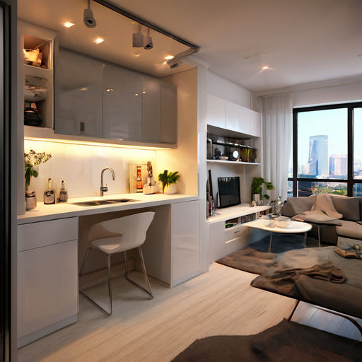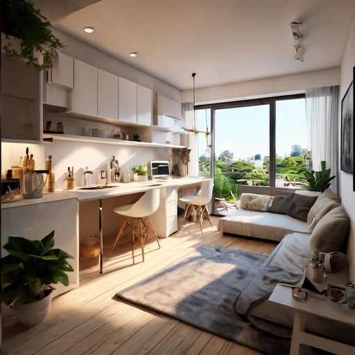 "원룸"의 가구는 일반적으로 공간 사용을 최적화하기 위해 최소주의적이고 다기능적입니다. 접이식 침대나 소파 침대, 컴팩트한 식탁, 옷장이나 수납장 같은 내장형 수납 솔루션, 그리고 냉장고, 전자레인지, 조리대와 같은 필수 가전제품이 갖춰진 소형 주방이 포함될 수 있습니다. 장식은 간단하고 현대적이며, 밝은 색상과 영리한 디자인 요소를 사용하여 개방감을 조성하는 경향이 있습니다.